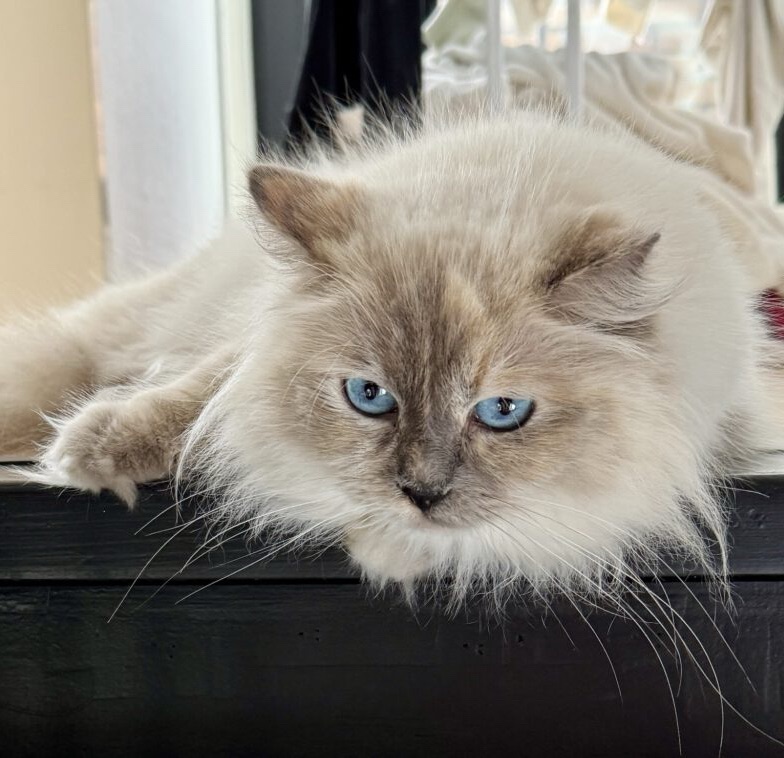 Puk of beter gezegd tante Puk is onze castraat van nu bijn 5 jaar oud (geboren op 31 mei 2020). Puk heeft geen stamboom en is als kitten al gesteriliseerd. Puk is vermoedelijk niet helemaal raszuiver en een kruising van een point en een mink ragdoll. Puk is heel erg graag buiten en komt op zijn tijd even een aaitje halen. Puk kan met iedereen hier overweg, vind nieuwe kittens de eerste paar dagen even spannend maar al snel gaat ze met ze spelen.
